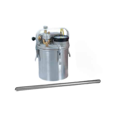 The type B pressure air meter flat gauge mount (white meter) measures entrained air in normal weight fresh mixed concrete.  The meter differs from others in that its gauge lays flat on its lid. The meter shows tare weight stamped in grams on the bottom for convenience. When used with the supplied nomograph, the air meter provides quick and easy particle density and percent of free moisture in aggregate determinations. Additionally, the meter comes with an aluminum tamping bar.